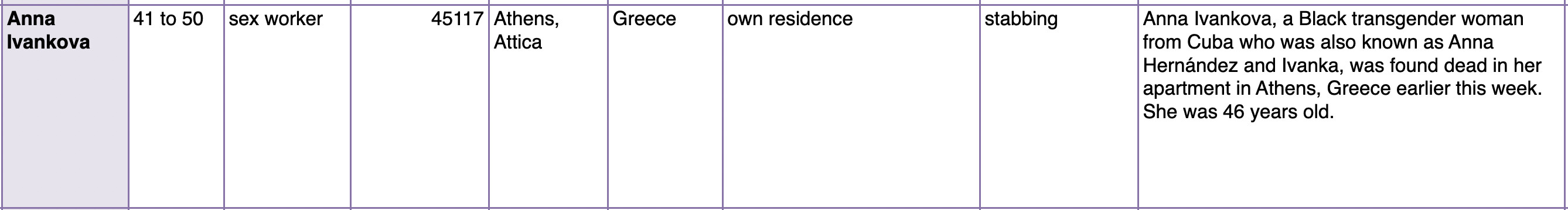 Η Άννα έχει καταγραφεί ως το 259ο θύμα τρανσφοβικής επίθεσης.