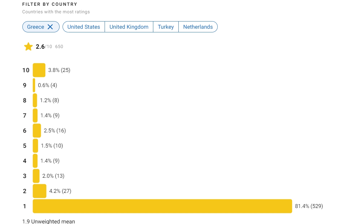 Το “1/10” έχει την τιμητική του στη χώρα μας με ποσοστά που φτάνουν στο 82%, ενώ τα αντίστοιχα για τις ΗΠΑ είναι 30%, για Βρετανία επίσης 30%, για Ολλανδία 20% και για Τουρκία 6%, με το τελευταίο στοιχείο να αποτελεί μια αντίστροφη εικόνα που ενδεχομένως θα αφορούσε την “ελληνική” συμπεριφορά έναντι κάποιου αντίστοιχου έργου που θα αφορούσε ιστορικό πρόσωπο της Τουρκίας. Η γενική βαθμολογία της σειράς φτάνει στο 5,2/10, κάτι που τελικά έχει να κάνει με το “καυτό” ζήτημα των ερωτικών σχέσεων του στρατηλάτη.